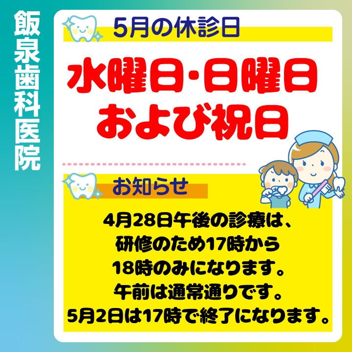 5月休診日情報 | つくば市みどりのの歯医者は飯泉歯科医院へ